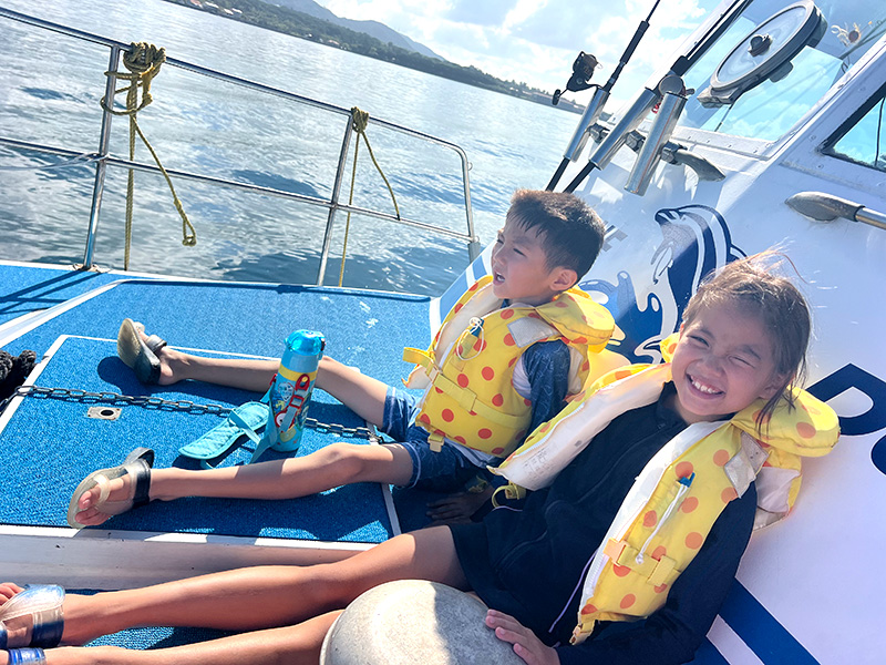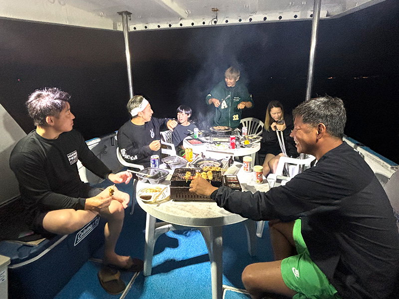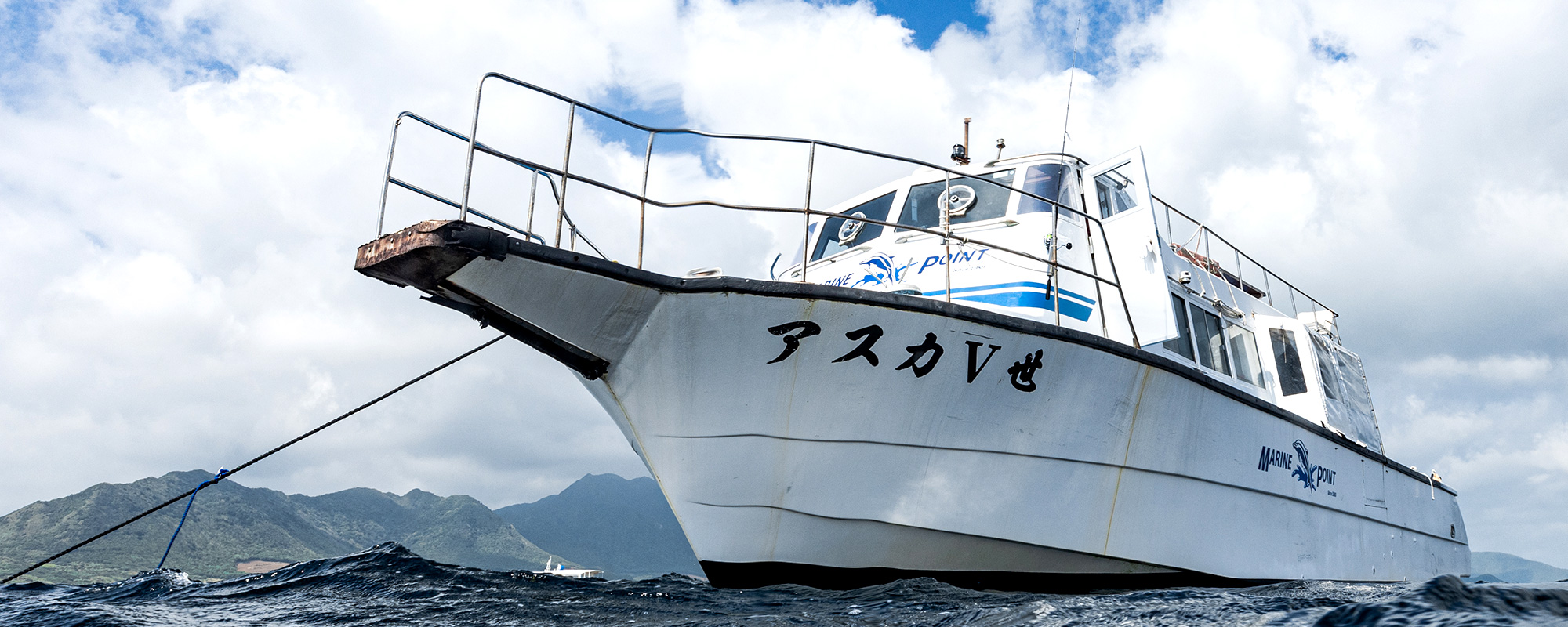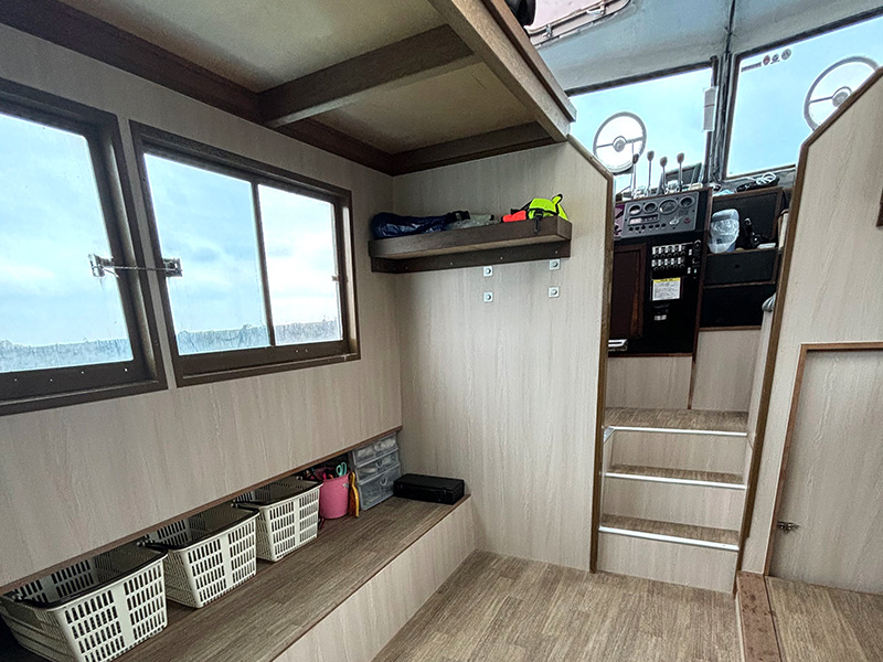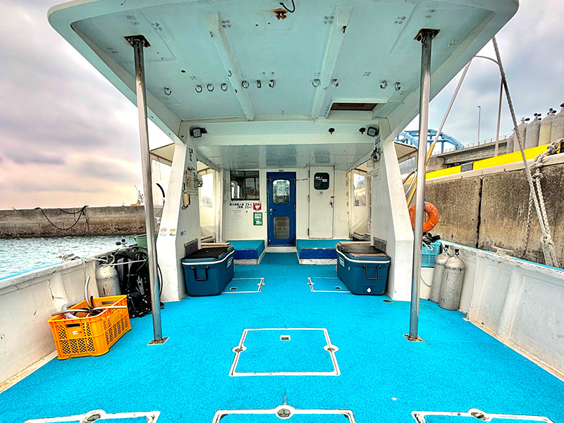 アスカ号に比べるとこつぶですが、小回りNO.1! 大きな船には不可能な浅いエリアの航行も問題ありませんので、ダイビングエリアがぐっと広がります。ご家族や少人数での貸切ツアーにもぴったりです。トイレ付き。